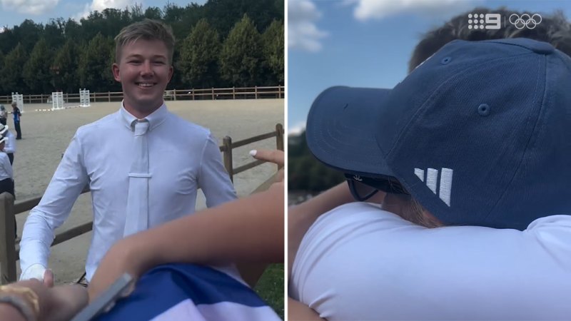 Olympic vaulter Harry Charles runs towards his girlfriend Eve Jobs after winning gold at the Paris Olympics. © International Olympic Committee