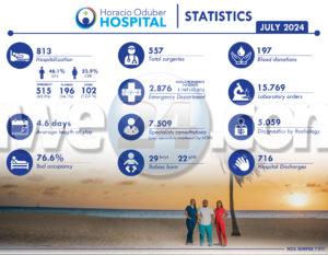 The Horacio Oduber Hospital once again shares its statistics for July 2024, with the aim of providing transparency to the Aruban community. These figures show how our hospital performs in terms of care, the number of patients seen per month, the number of babies born, as well as the diagnostic and blood donation sections.