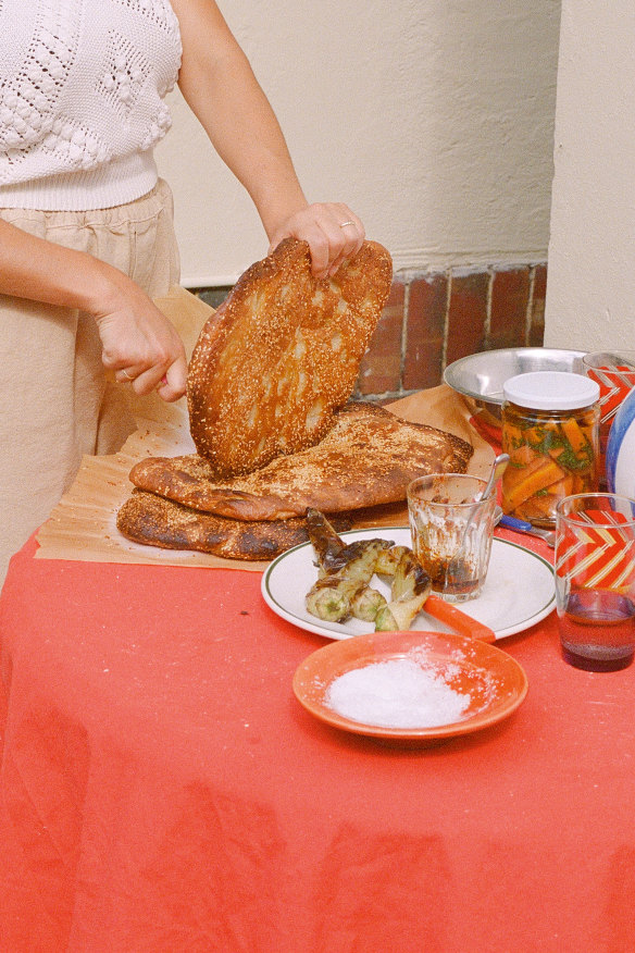 This bread has the same basics as the classic focaccia recipe, but without the emphasis on making a tall, fluffy loaf. This bread is flatter than focaccia and has a toasted, nutty sesame flavor. I toast the bread until it’s very dark, almost burnt. Cut into long strips and piled together, this flatbread looks great dragged through matbukha or chraime fish sauces, or topped with green chilies and tahini. Or you can combine this flatbread with focaccia for a summer grilled meat feast, served with tomatoes drizzled with olive oil and zhoug.