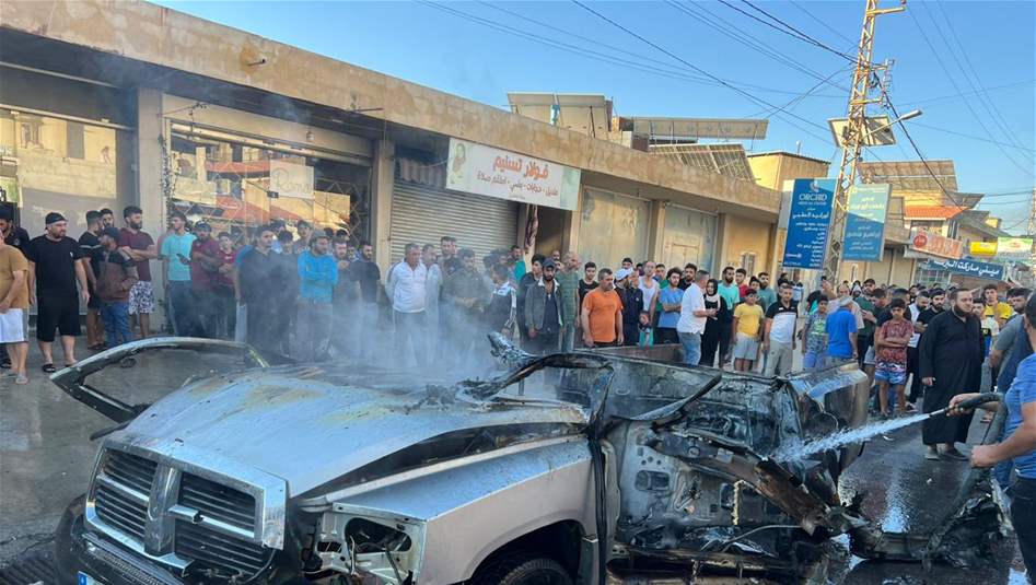 Activists circulated video footage shot by a surveillance camera at a store in the Western Bekaa, showing the moment the car was targeted by an Israeli drone.
