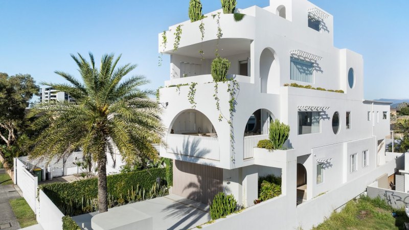 Just a short distance from the beach, Nirvana is a Mediterranean-style home with a predominantly white color scheme, stone and wood accents, and travertine floors. The property has four floors, including a full-floor master bedroom, a rooftop terrace and sauna, two living areas, multiple open-air spaces, and a plunge pool.