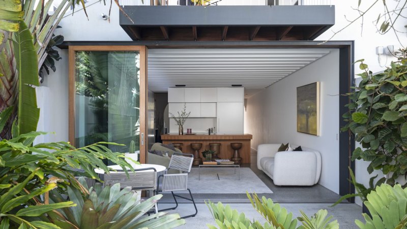 This split-level home designed by SRH Architecture is within walking distance of Orange Grove Public School. The central living room with custom cabinetry and study nook overlooks the plunge pool, while the bright eat-in kitchen opens to the landscaped rear garden with a timber deck and built-in barbecue.