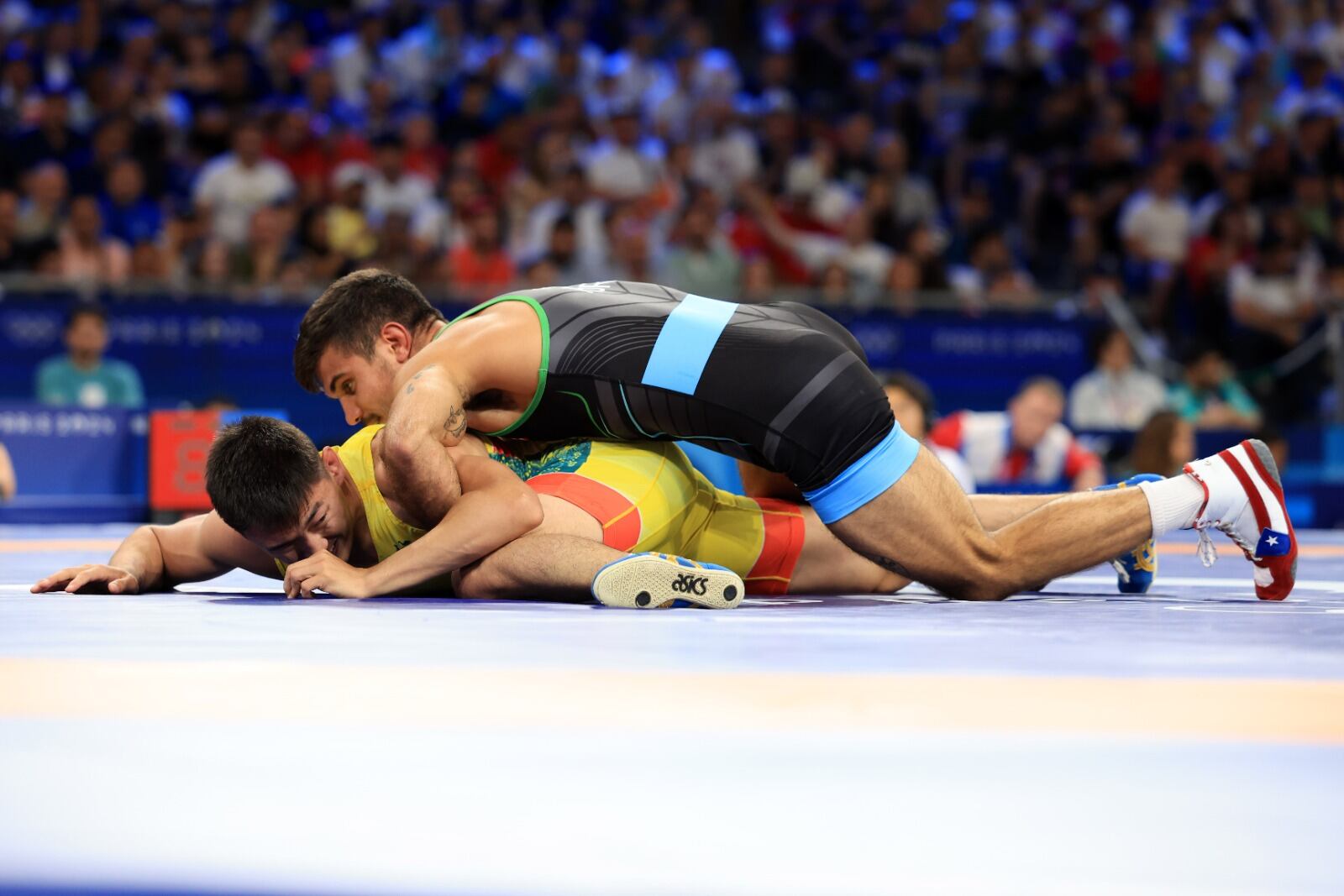 Wrestler Sebastián Rivera qualified for the quarterfinals by defeating Russian player Georgii Okorokov, who represented Australia, 12-2 on Mat A of the Champs de Mars Arena, his first fight of the day.