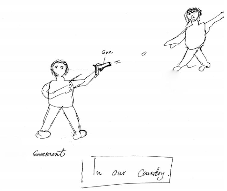 Children often describe distressing conditions in the countries they have fled (see the drawing below by a 16-year-old unaccompanied minor).