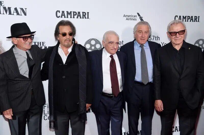 Joe Pesci (left) and Robert De Niro (second from right) are digitally brought to life in “The Irishman,” directed by Martin Scorsese (center). Photo: Getty Images